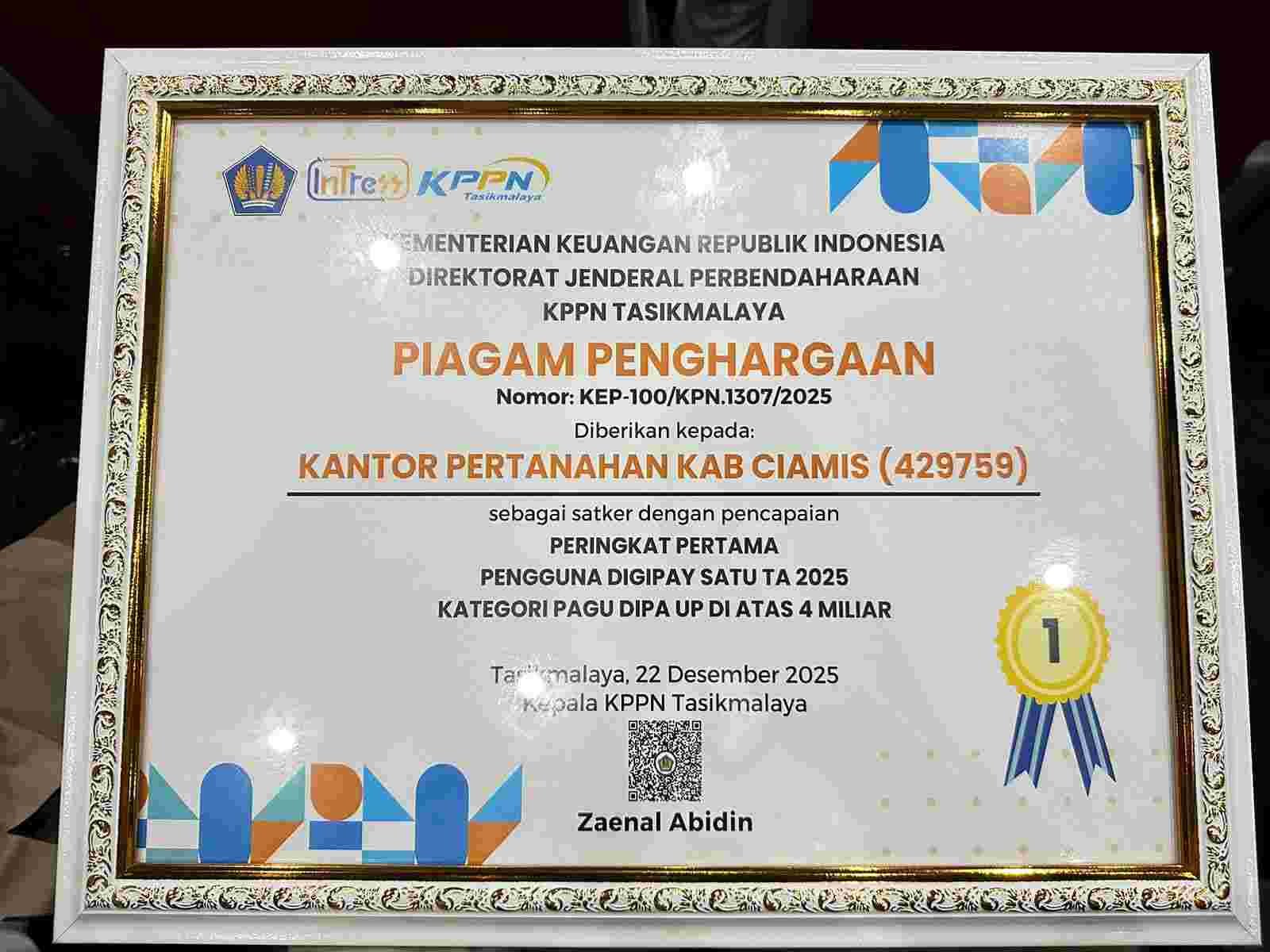 Capaian ini menjadi bukti keberhasilan Kantor Pertanahan Kabupaten Ciamis dalam menerapkan tata kelola keuangan negara yang efektif, efisien, dan berintegritas sepanjang Tahun Anggaran 2025, khususnya dalam pemanfaatan transaksi non-tunai melalui platform Digipay Satu.