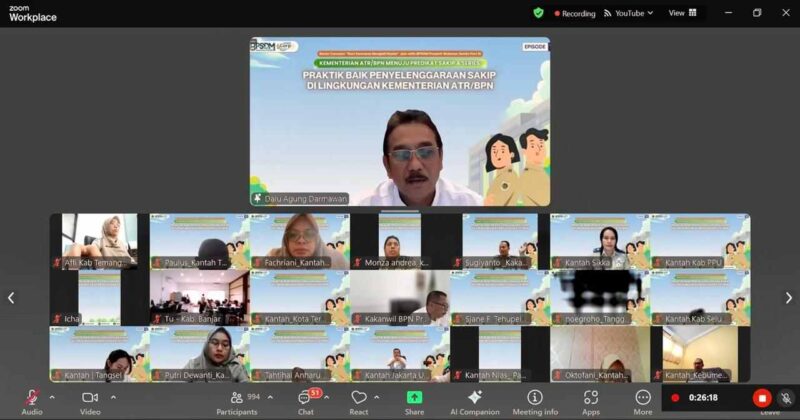 Webinar yang mengusung tema “Menuju Predikat SAKIP A: Praktik dalam Penyelenggaraan SAKIP di Lingkungan Kementerian ATR/BPN” ini menghadirkan narasumber dari sejumlah satuan kerja yang konsisten meraih predikat SAKIP “A”. Mereka antara lain Sekretaris Direktorat Jenderal Tata Ruang, Reny Windyawati; Kepala Kanwil BPN Provinsi DKI Jakarta, Alen Saputra; Kepala Kanwil BPN Provinsi Jawa Timur, Asep Heri; Kepala Kanwil BPN Provinsi Kalimantan Selatan, Abdul Azis; dan Kepala Kantor Pertanahan Kabupaten Lamongan, Agung Basuki.